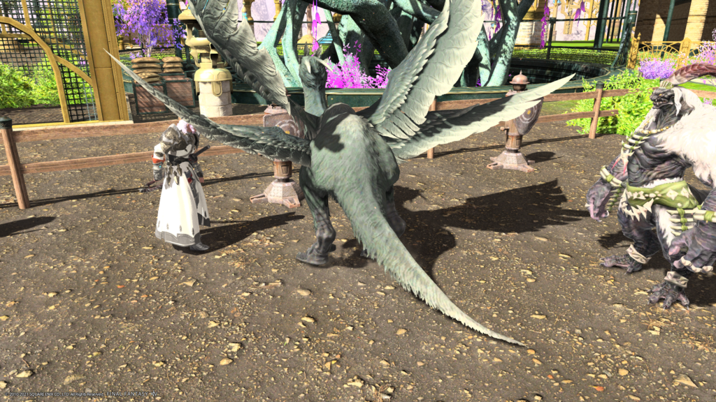 エオルゼアではそこかしこにチョコボ牧場や小屋がありますが、ノルヴラントではアマロが主に飼育されてるんですね…異文化…。クリスタリウムの牧場にはチョコボも飼われているようでしたが、キャリッジ輸送用に主に使われているようでしたし遠出ではアマロによる飛行移動がメインとのことで、飛行できるチョコボはここでは飼われていないみたいでしたね。