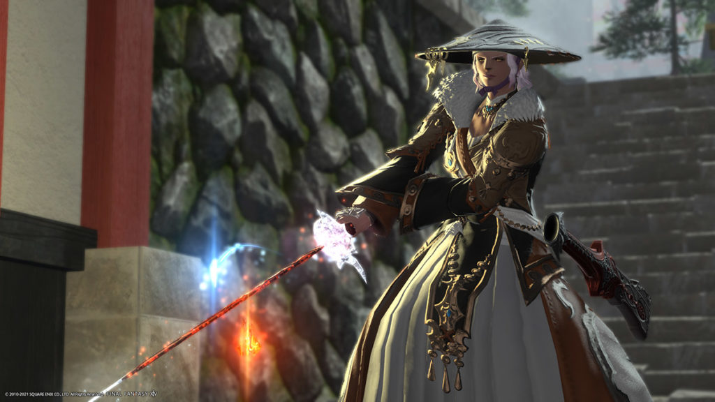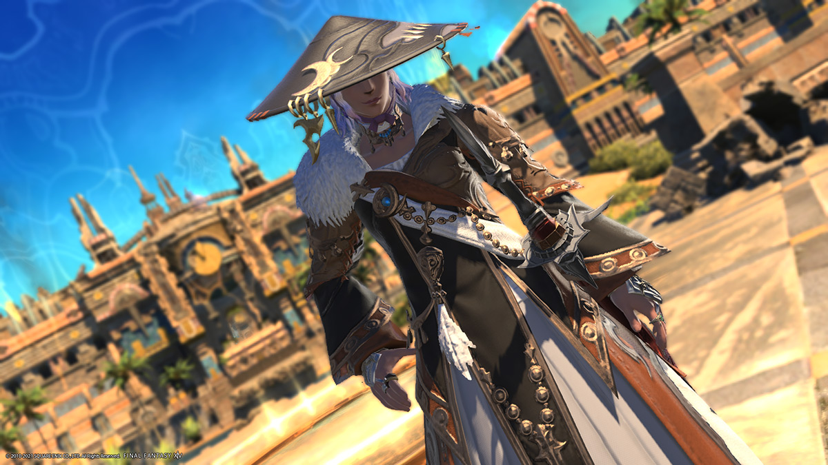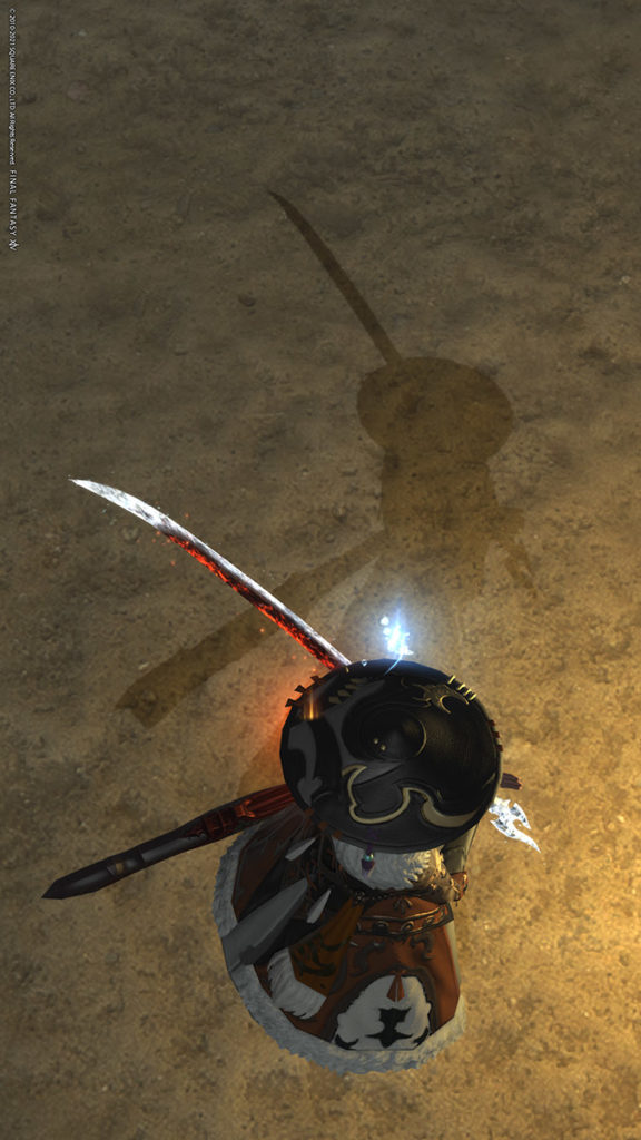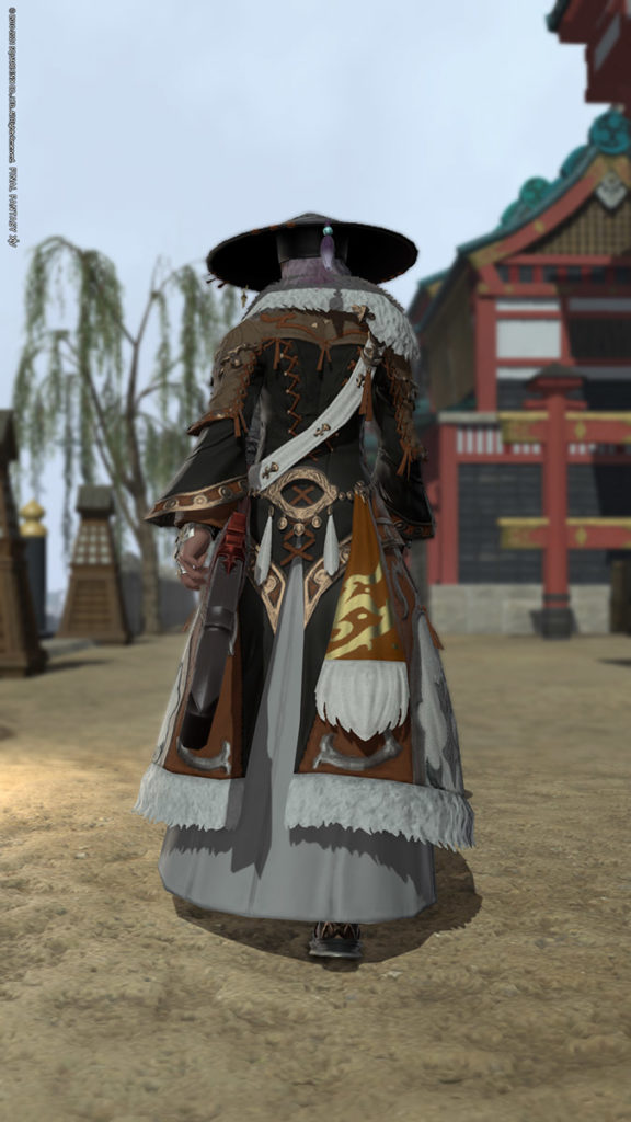 笠と全身に巻かれた金色ジャラジャラ、襟の肉厚なモフモフ。侍=紅蓮エリア!と思って何の気なしにクガネに撮りに行っちゃいましたが、だいぶ異邦のナリだなあ…。