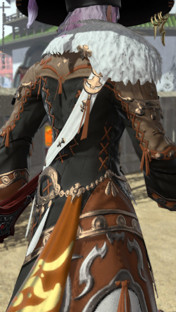 入手先はアム・アレーン辺りでしたが、同デザインの色ジョブ違い装備にアラミガンレンジャー・コートやアラミガンキャスター・コートがあるので、この型は荒野の定番なのかもしれません。革紐っぽい感じの編み上げが沢山ついてるのも良いですね…!!