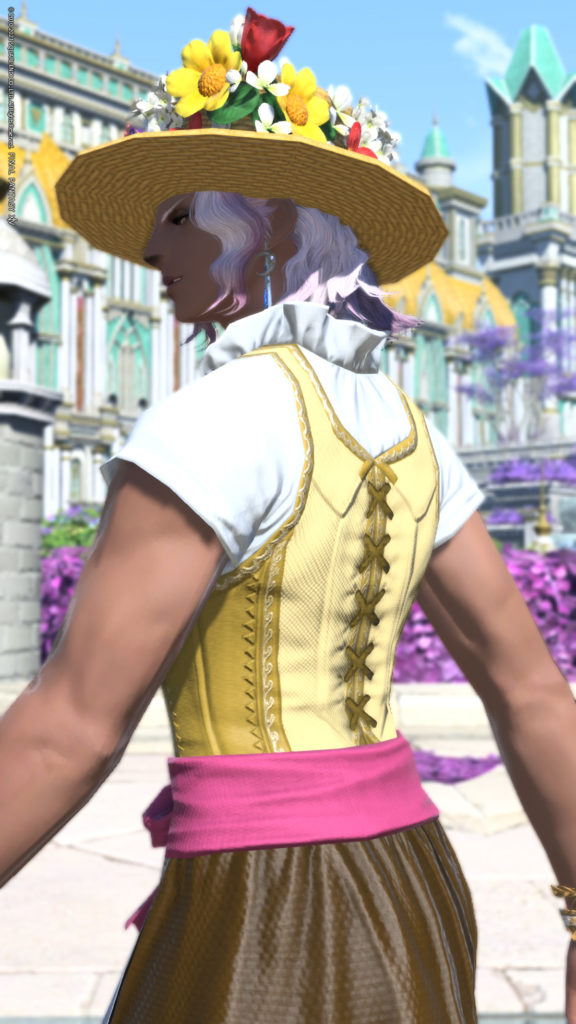 今回のミラプリは帽子や花を特に目立たせて見せたかったので、ロングスカートとパンプスは同じ色にして、落ち着いた雰囲気にしています。エプロン部分の染色はスカートと同様に染まるので、淡くするとレースのような趣にもなります。