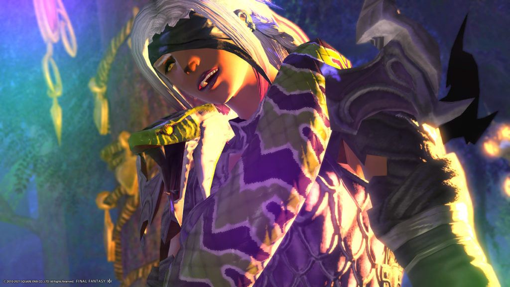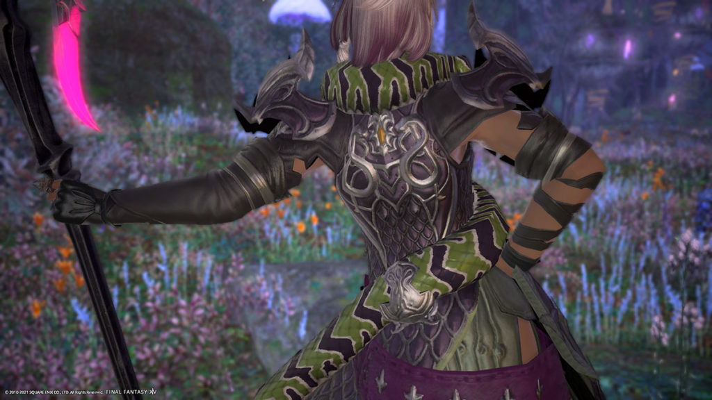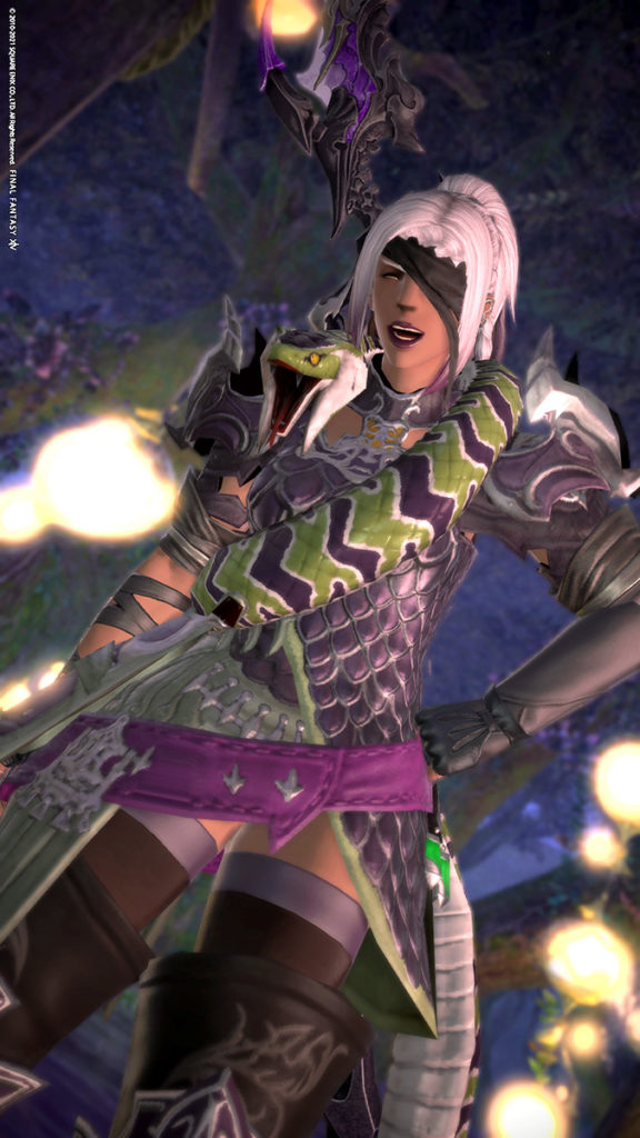 ぐるっと巻かれたでっかい蛇、鎧の鱗、あと何気に染色できるのもいいですね!!元カラーは緑系ですが、蛇と同化して見えるのがもったいなかったのでパープル系にまとめてみました。手袋と頭装備をアシメトリの物にして、髪型も何か斜めに巻かれてる感じがよかったので、ギラバニアンブレイドにしています。